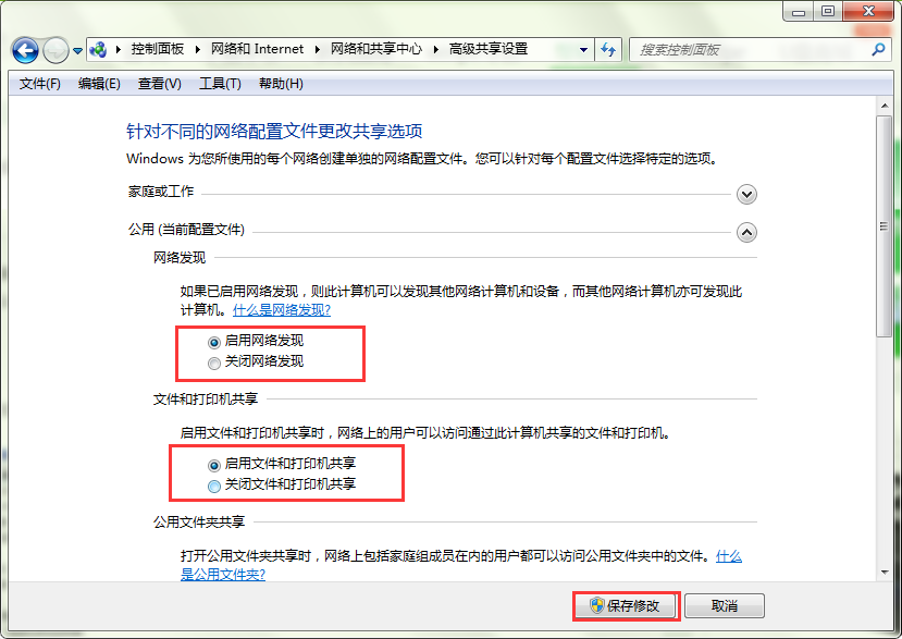 6、最后,在打开的“高级 共享设置”窗口中,全部选择“启用网络发现”以及“启用文件和打印机共享”。如图所示: